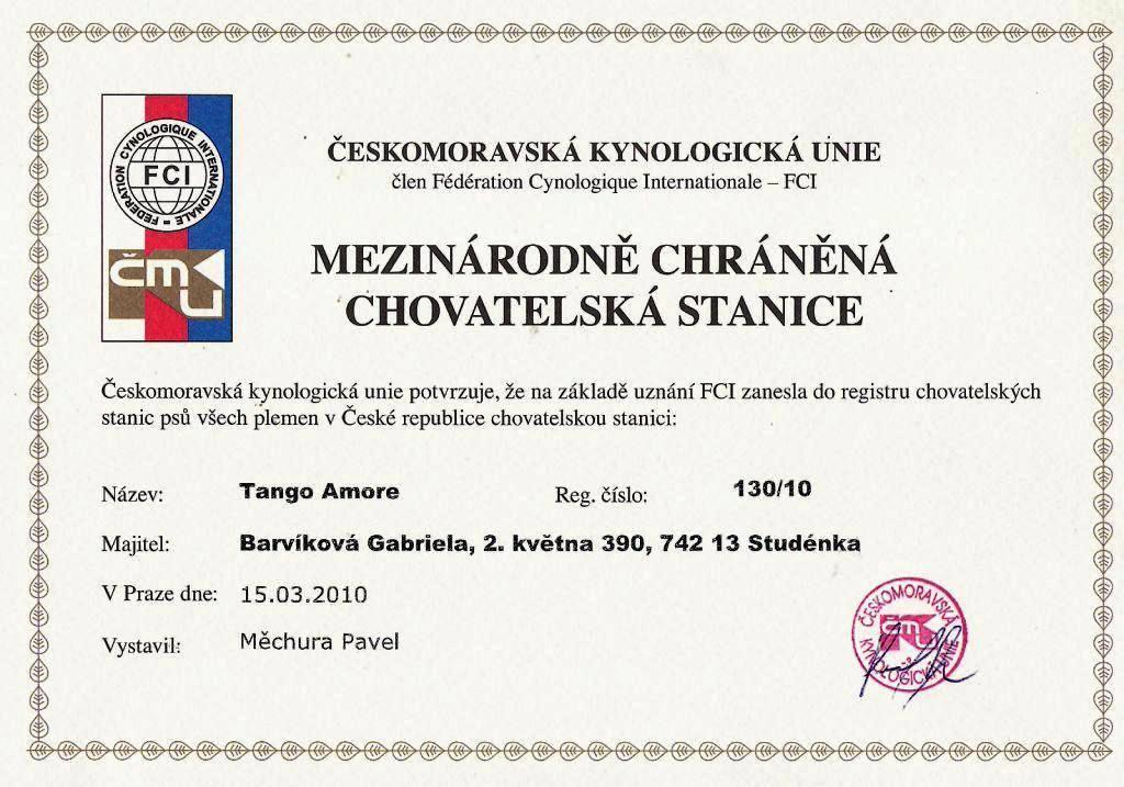 Reg. číslo CHS: 130/10 Certifikát CHS:Zobrazit Certifikát ::: Plánujeme vrh: 23.07.2010 Hodnocení: 90 bodů ze 100