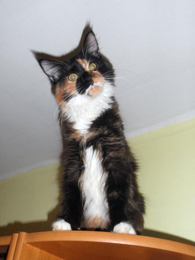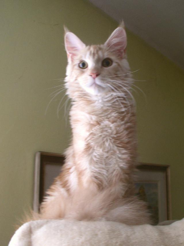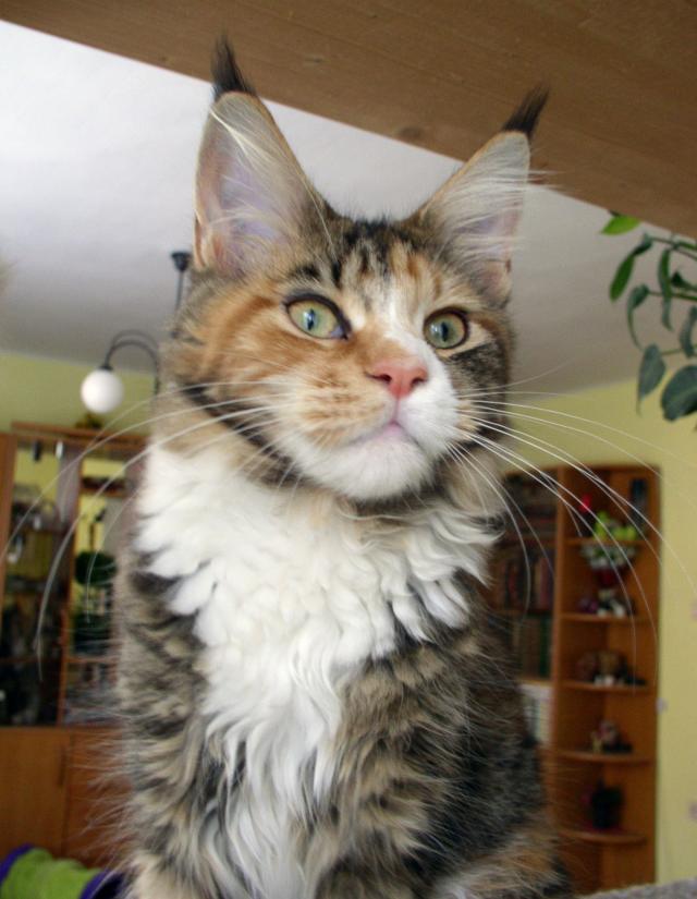 O plemeni:Mainská mývalí kočka je největším zástupcem koček na planetě. Je to přírodní plemeno, které pochází z venkovských usedlostí severního státu Maine - USA. Charakteristickými rysy jsou "rysí" štětičky na uších, mohutná stavba těla, dlouhý huňatý ocas. Často ji zdobí bohatý límec delší srsti na krku. Charakteristické je i její mňoukání, které bývá přirovnáváno k holubičímu vrkání. Vyhovuje jí život v bytě i eventuální možnost poobytu v chráněných venkovních prostorách. Je to nepřehlédnutelný šlechtic mezi kočkami.