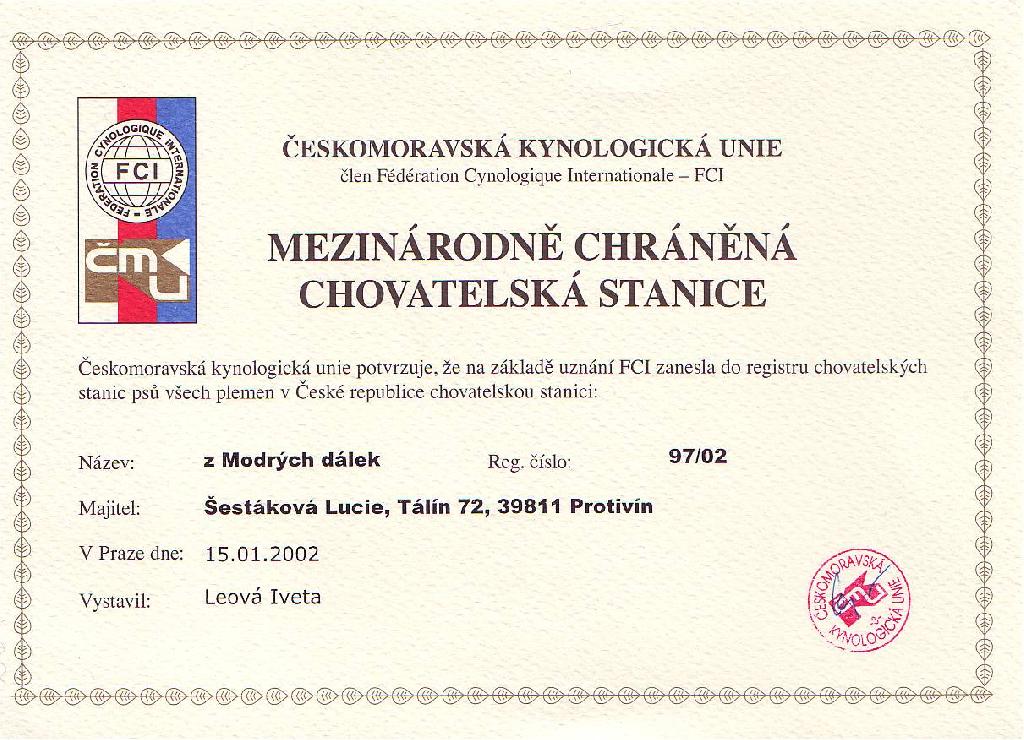 Reg. číslo CHS: 97/02 Certifikát CHS:Zobrazit Certifikát ::: Plánujeme vrh: 20.06.2010 Hodnocení: 96 bodů ze 100